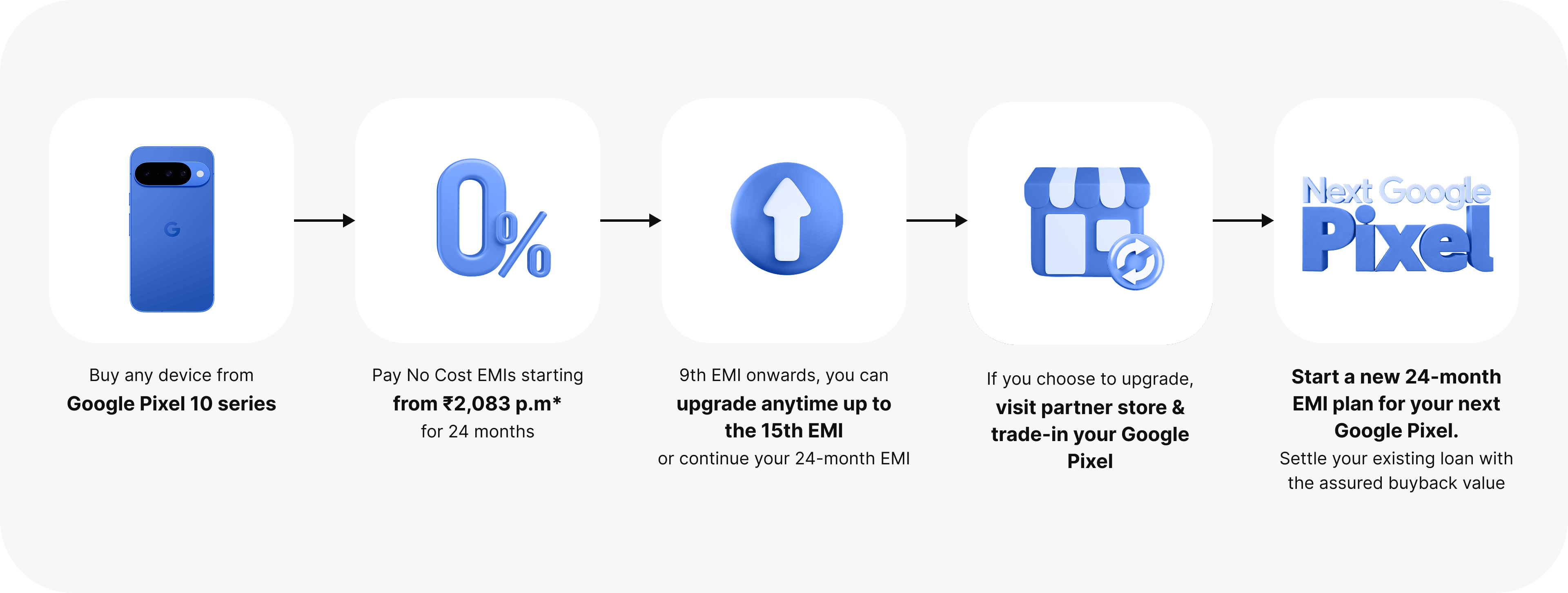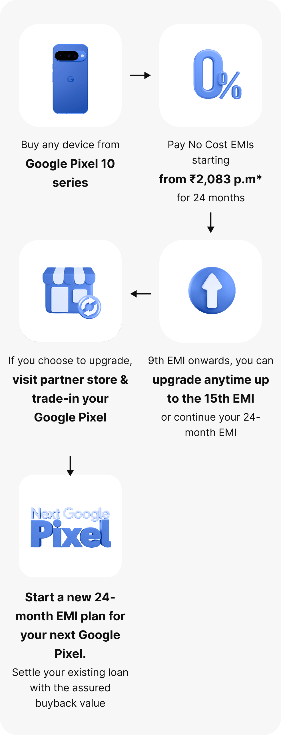 Starting at ₹2,083 p.mPay for your new Google Pixel over time in 24 affordable monthly instalments with zero downpayment and no interest cost. You’re eligible to upgrade to a new Google Pixel once you have made 9 EMI payments.New